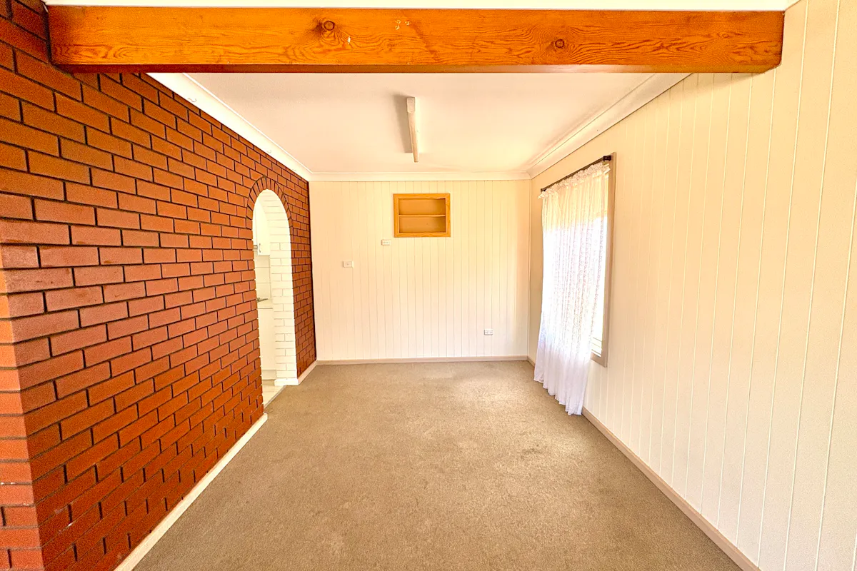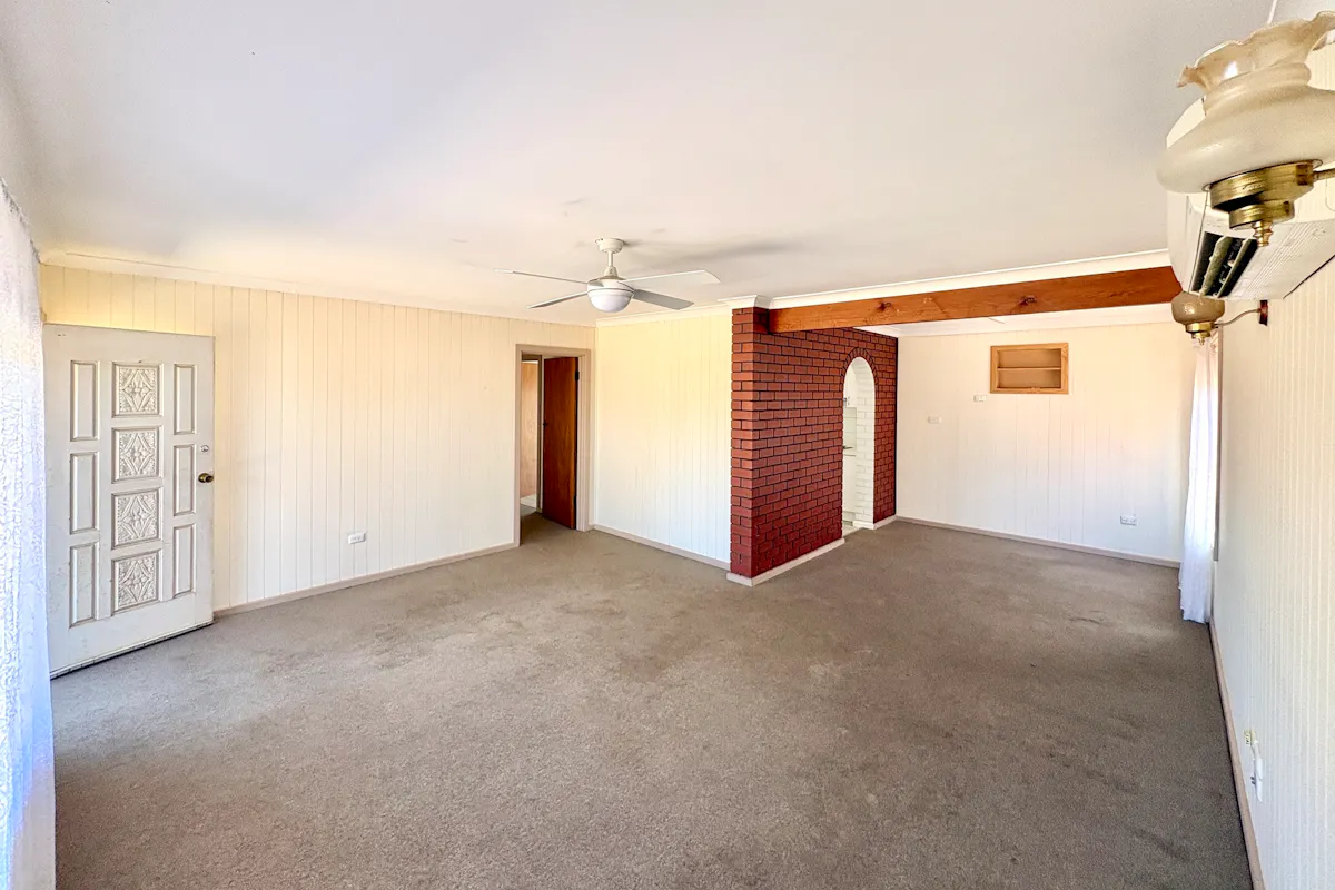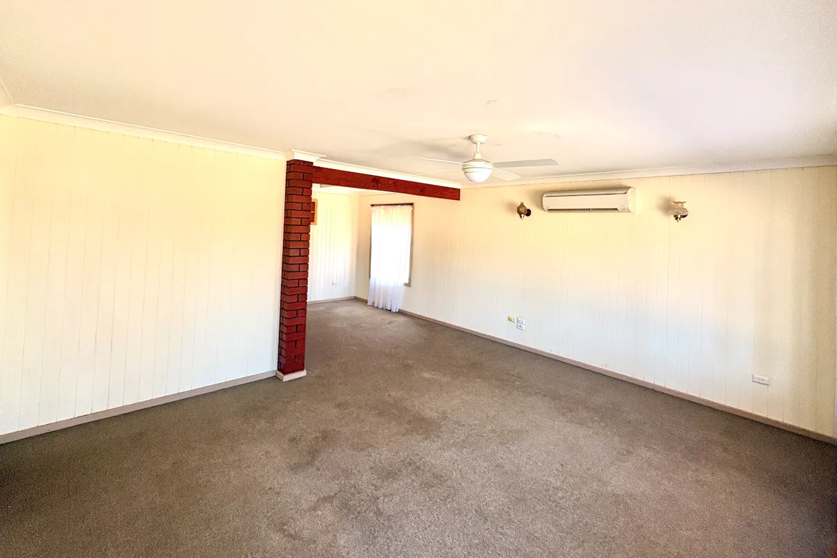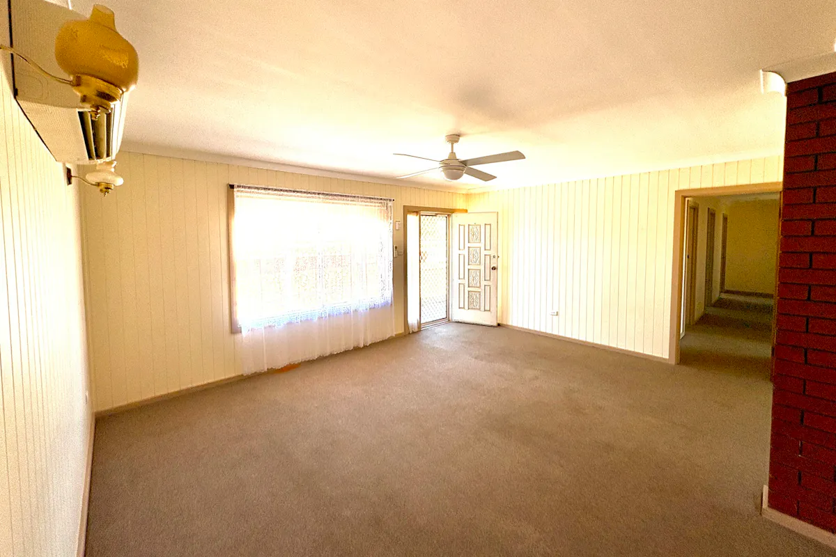 Step through the white front door into the generous combined lounge and formal dining area. Freshly painted white walls over traditional wood paneling create a light, airy atmosphere. Comfort is assured with reverse-cycle air conditioning and a ceiling fan with light. Colonial-style windows dressed with lace curtains or horizontal blinds complement the home's classic charm. Soft carpet flows throughout, with a vinyl floating floor in the kitchen and tiled wet areas for practicality.