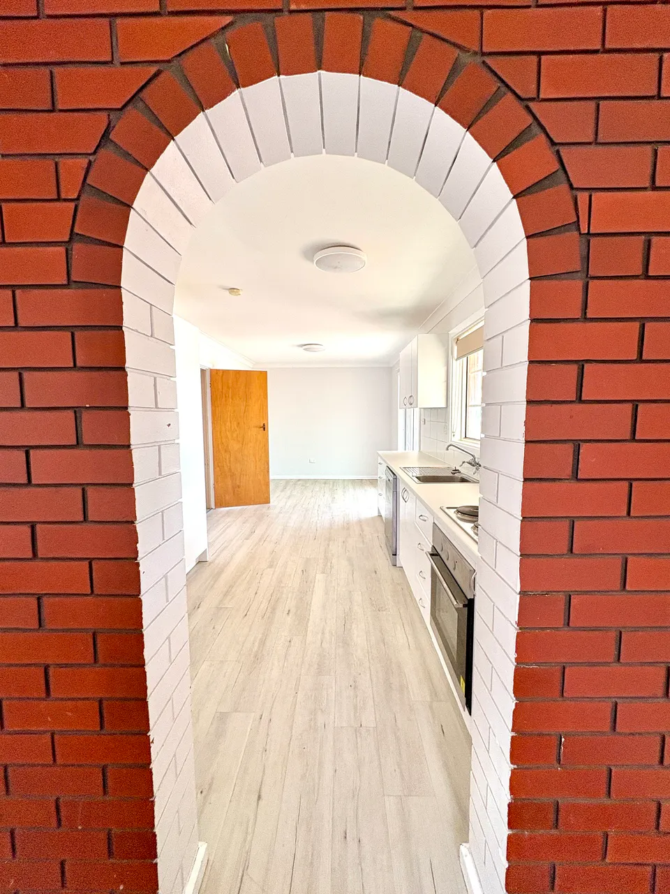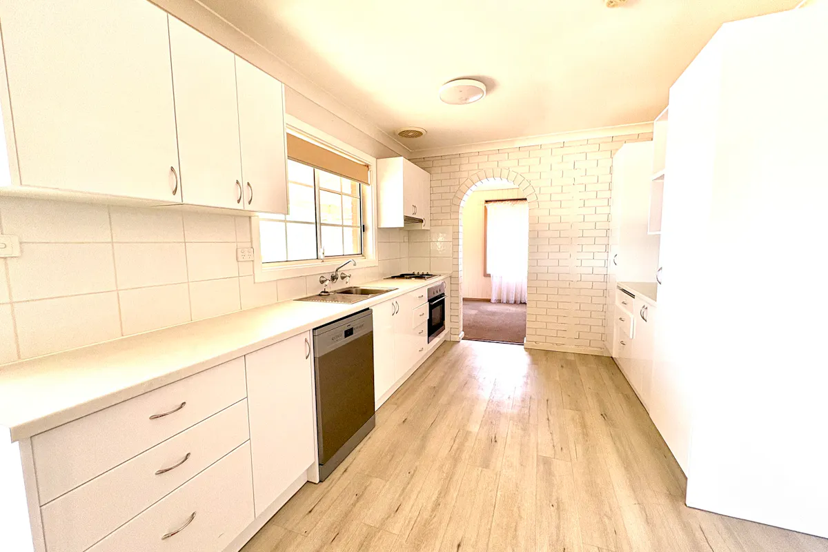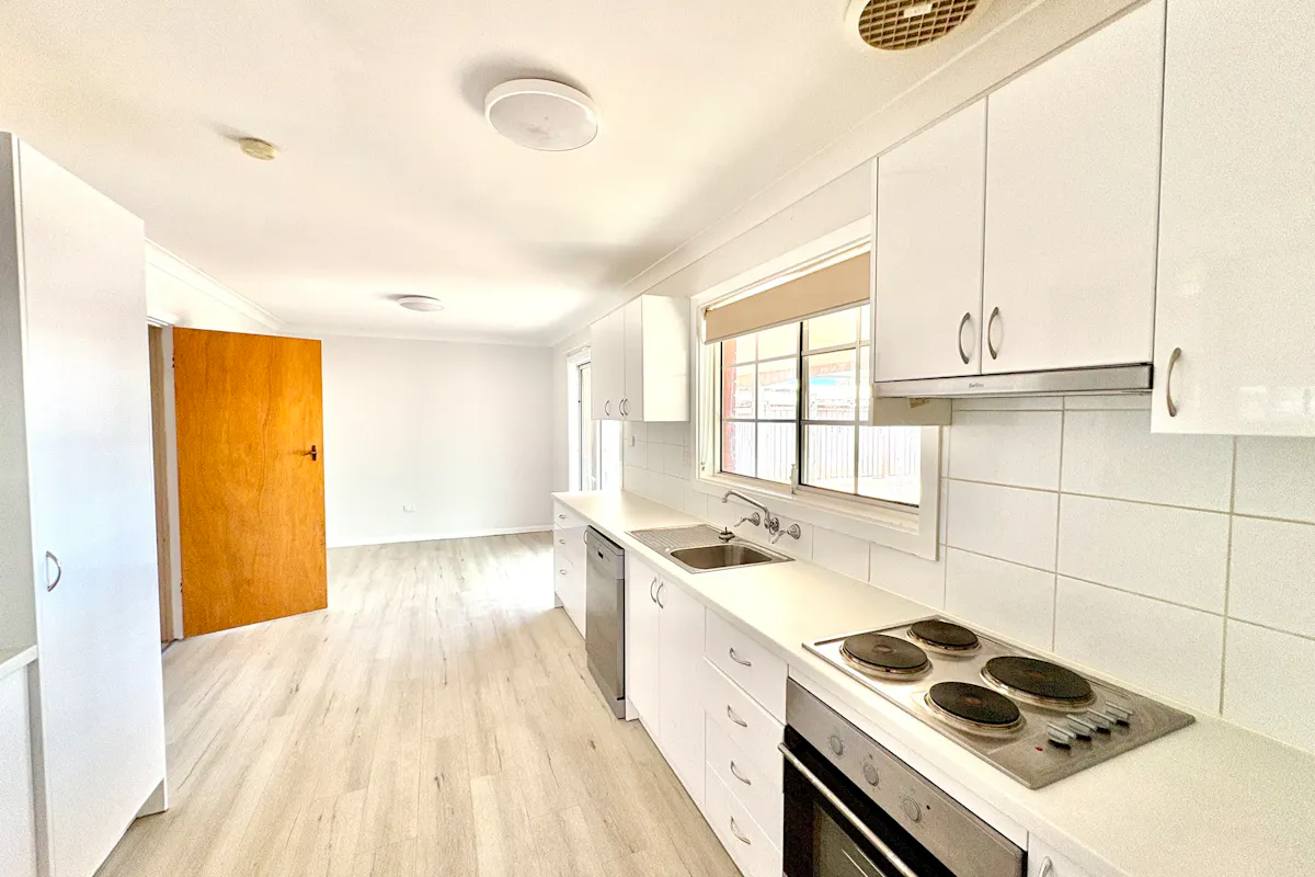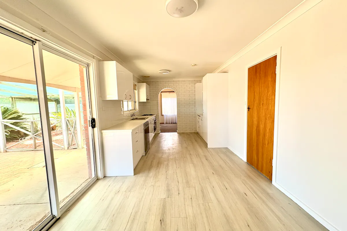 The renovated white kitchen is both stylish and functional, featuring an under-bench electric oven, bench cooktop with overhead rangehood, SMEG dishwasher, two tall pantry cupboards (including pull-out steel shelving), microwave alcove, and ample space for a large fridge. Three sets of overhead cupboards and generous soft-close drawers and cabinetry provide abundant storage. There's even room for casual dining beside the glass sliding door, which opens onto the rear verandah and paved pergola area.