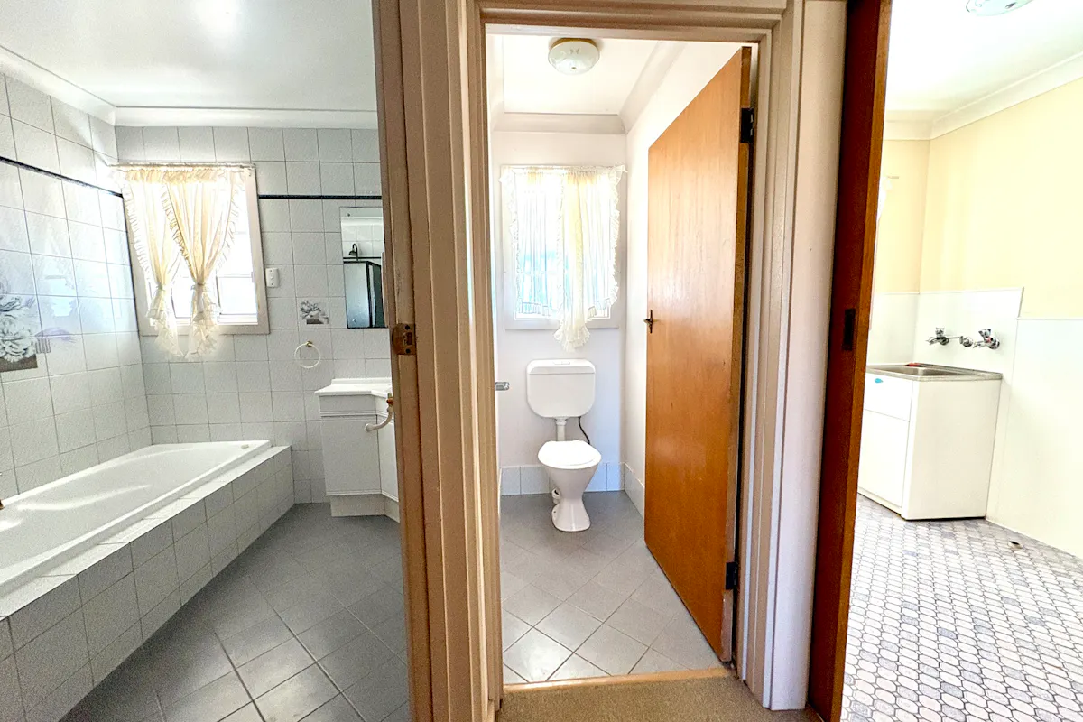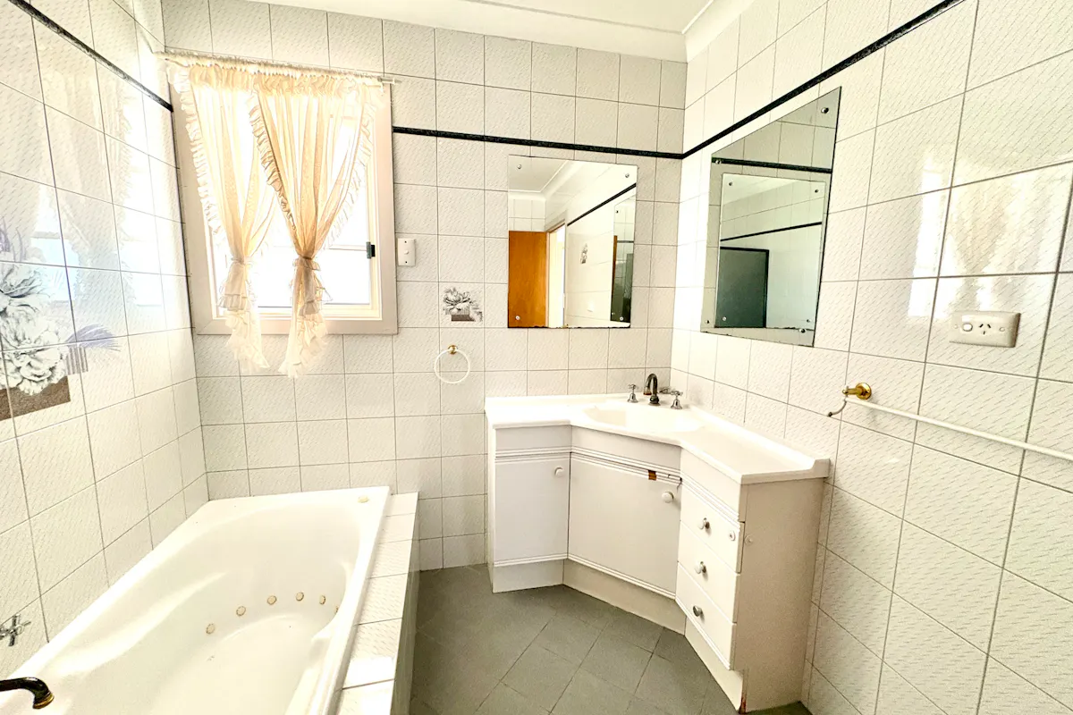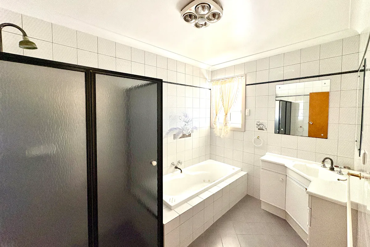 All three bedrooms are generously sized, with the main bedroom boasting a full wall of built-in robes and a ceiling fan. The renovated bathroom delivers a touch of luxury with a long dark-glass shower alcove, built-in white spa bath, corner vanity with dual mirrors, and four heat lamps with light and exhaust. The toilet is conveniently separate.