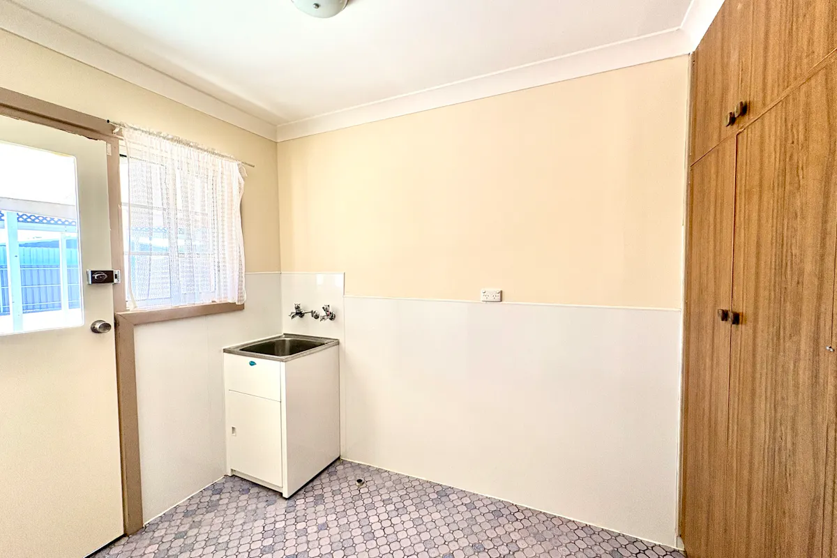 The laundry is equally impressive, offering a full wall of built-in linen and broom cupboards, stainless steel wash trough, and direct external access to the rear sloped verandah that runs the length of the home.