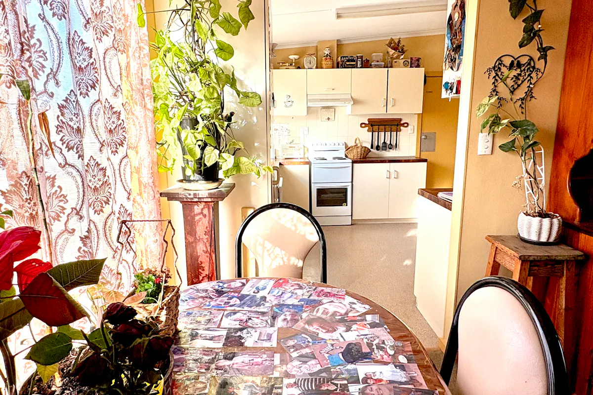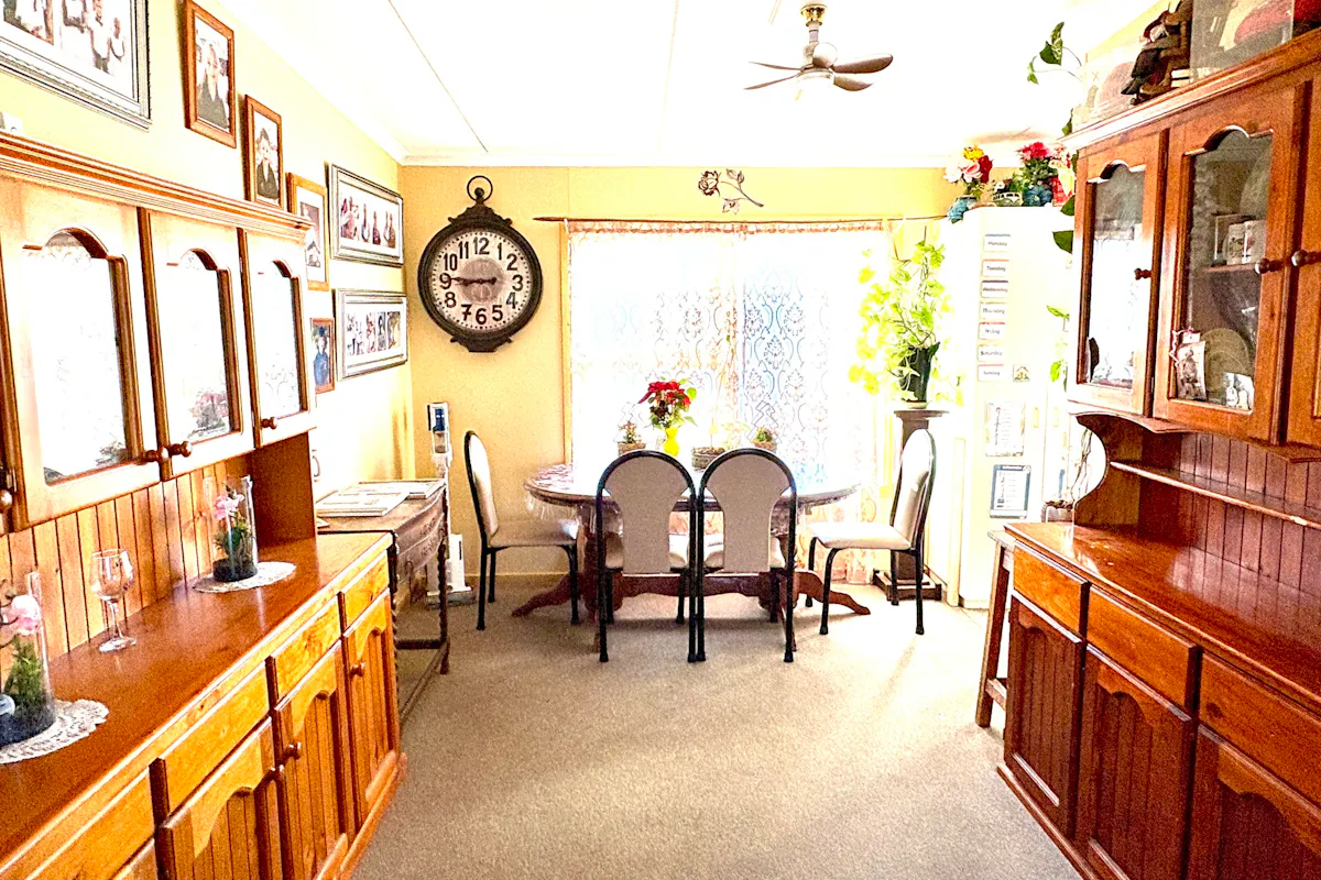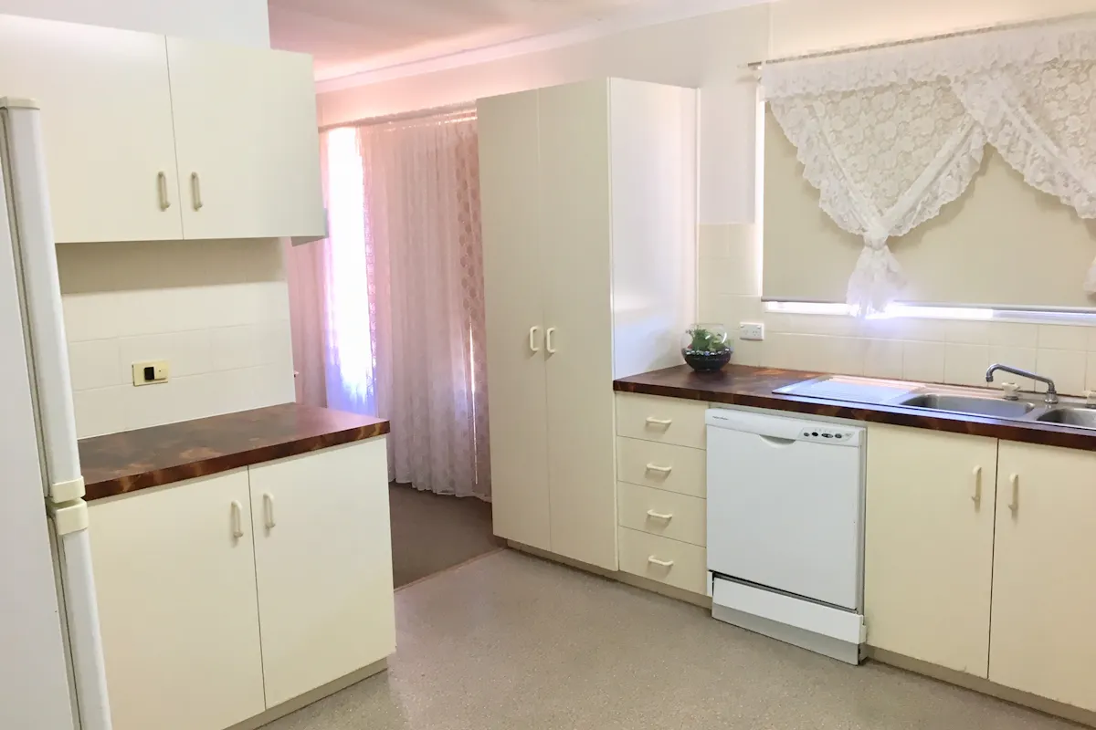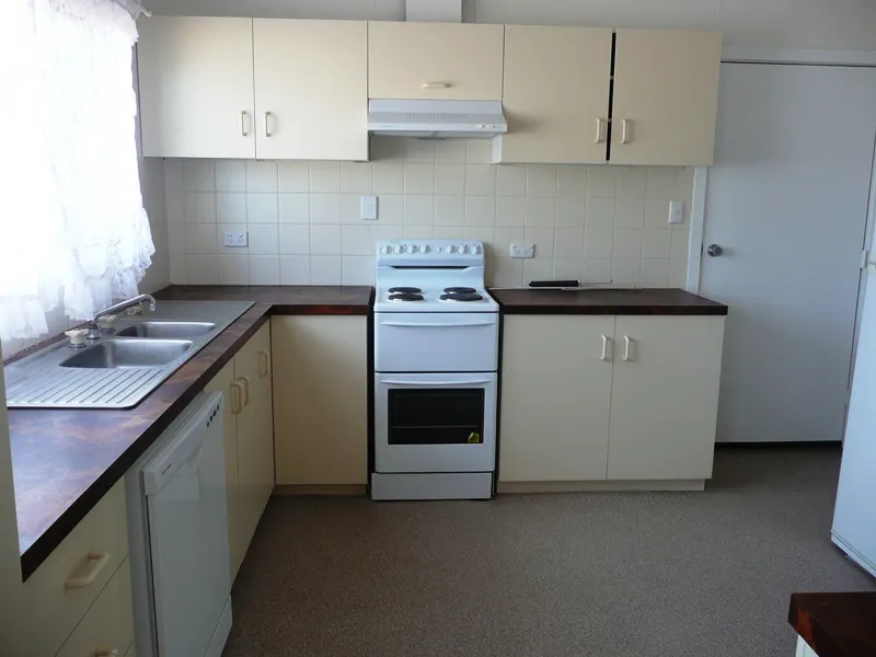 The kitchen is thoughtfully laid out to maximise space and storage. It includes an electric oven and grill with overhead rangehood, dishwasher, long two-door pantry cupboard, generous bench space and ample overhead cabinetry. There is room to accommodate any size refrigerator, and a convenient external door in the corner leads directly to the enclosed rear wooden porch. Durable vinyl flooring ensures easy care and longevity.