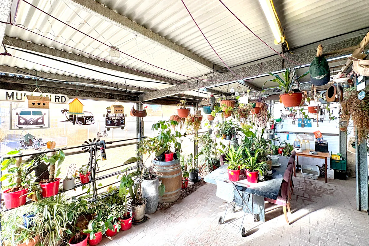 Stepping outside, a small timber deck leads to a shade-cloth enclosed pergola and entertaining area with paving and established garden borders, creating a pleasant space to relax or host gatherings. The rear yard is further enhanced by an impressive 6m x 6m double garage with concrete flooring, power, fluorescent lighting and metal workbenches, along with a 3m x 3m garden shed and a cubby house. Dual access to the block adds flexibility for vehicles, trailers or additional storage.